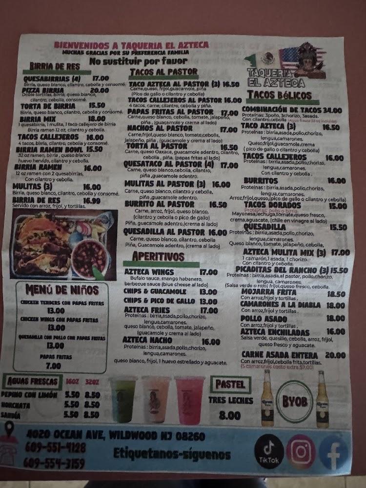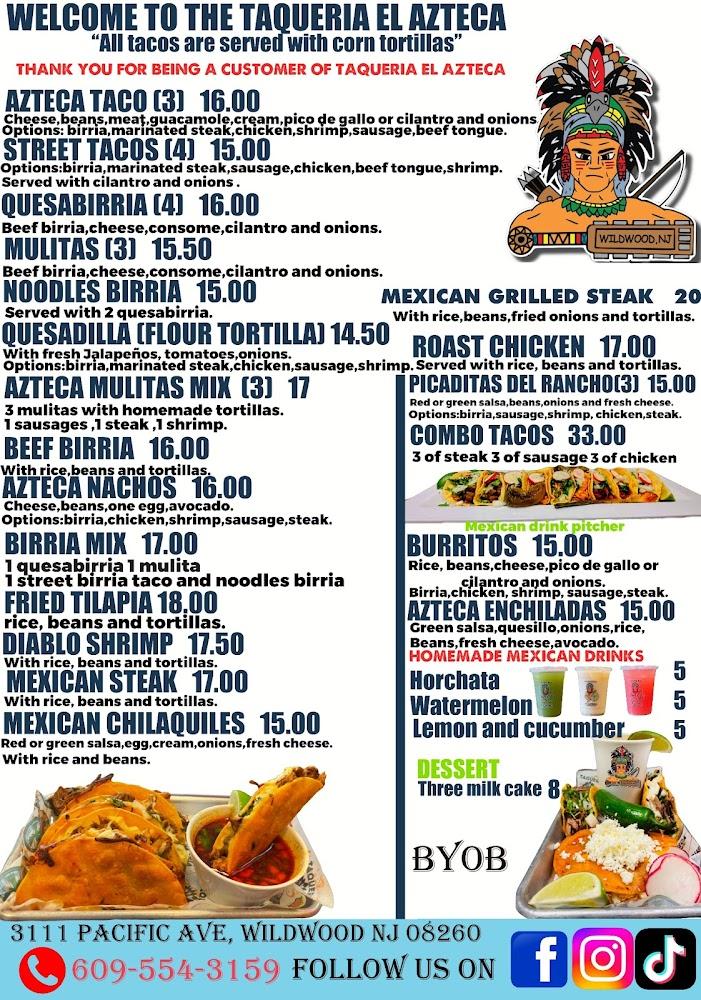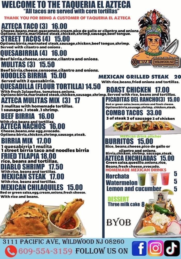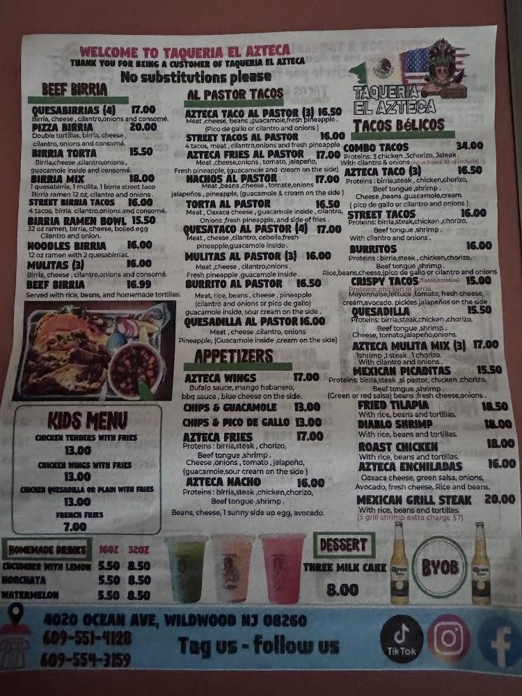 Welcome to Taqueria El Azteca, your local haven for authentic Mexican cuisine in Wildwood, NJ! Specializing in mouthwatering dishes like qasabirria, tacos, burritos, and enchiladas, we blend traditional flavors with a casual dining experience. Our vibrant atmosphere is perfect for solo diners and groups alike, and our fast service ensures you wonโt keep your appetite waiting. Enjoy convenient options such as contactless delivery, takeout, or dine-in at our accessible location. With a delightful menu offering everything from mojarra frita to tasty desserts, let us cater to your cravings. Visit us at 4020 Ocean Ave or call +1 609-554-3159 to experience the best of Mexican flavors today!